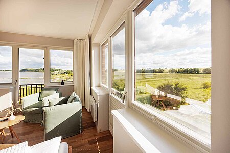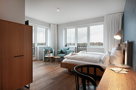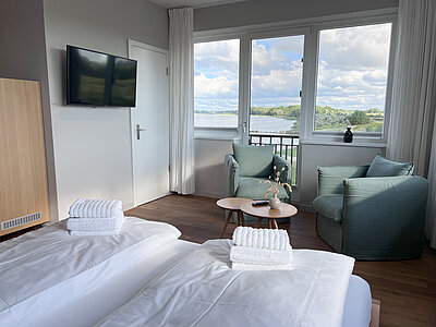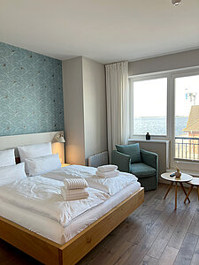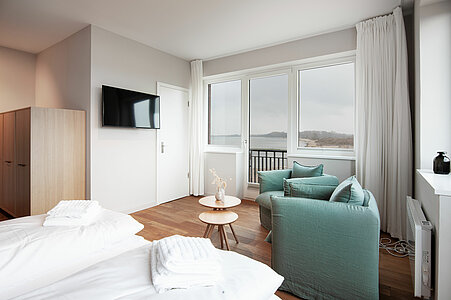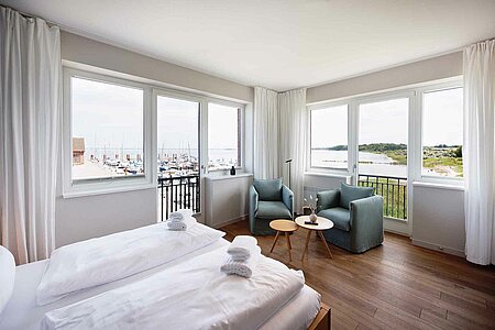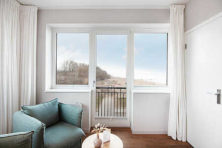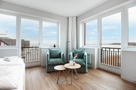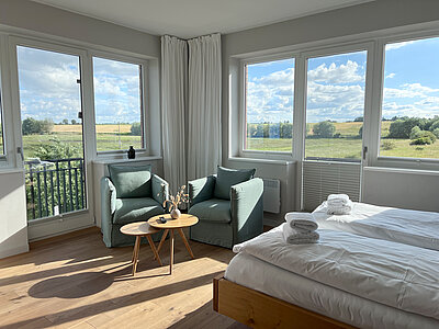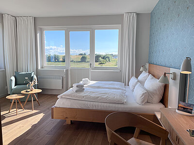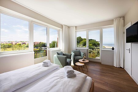 Erleben Sie entspannten Komfort in unseren vier Premium-Zimmern, die Ihnen auf großzügigen ca. 24 qm Wohnfläche einen Wohlfühlort bieten. Genießen Sie den weiten Blick über Land und Meer (mit einem seitlichen Meerblick), der Ihre Sinne verzaubert. Die Premium-Zimmer sind mit einem angrenzenden, modernen Tageslicht Bad ausgestattet, das über eine bodengleiche Dusche verfügt und höchsten Komfort bietet. Ein stilvoller Sekretär lädt dazu ein, Ihre Urlaubspostkarten an Freunde und Familie zu schreiben. Entspannen Sie in den gemütlichen Lesesesseln mit einem guten Buch und einem Glas Wein und lassen Sie die Seele baumeln. Ein praktischer Mini-Kühlschrank, dezent im Schrank verborgen, steht Ihnen für Ihre Getränke und Snacks zur Verfügung. Für eine ungestörte Nachtruhe sind sowohl ein Schlafzimmerfenster als auch ein Badezimmerfenster mit Moskitonetzen ausgestattet, sodass Sie die frische Luft in vollen Zügen genießen können. Erleben Sie den perfekten Mix aus großzügigem Komfort und schönster Aussicht in unseren liebevoll eingerichteten Premium-Zimmern.